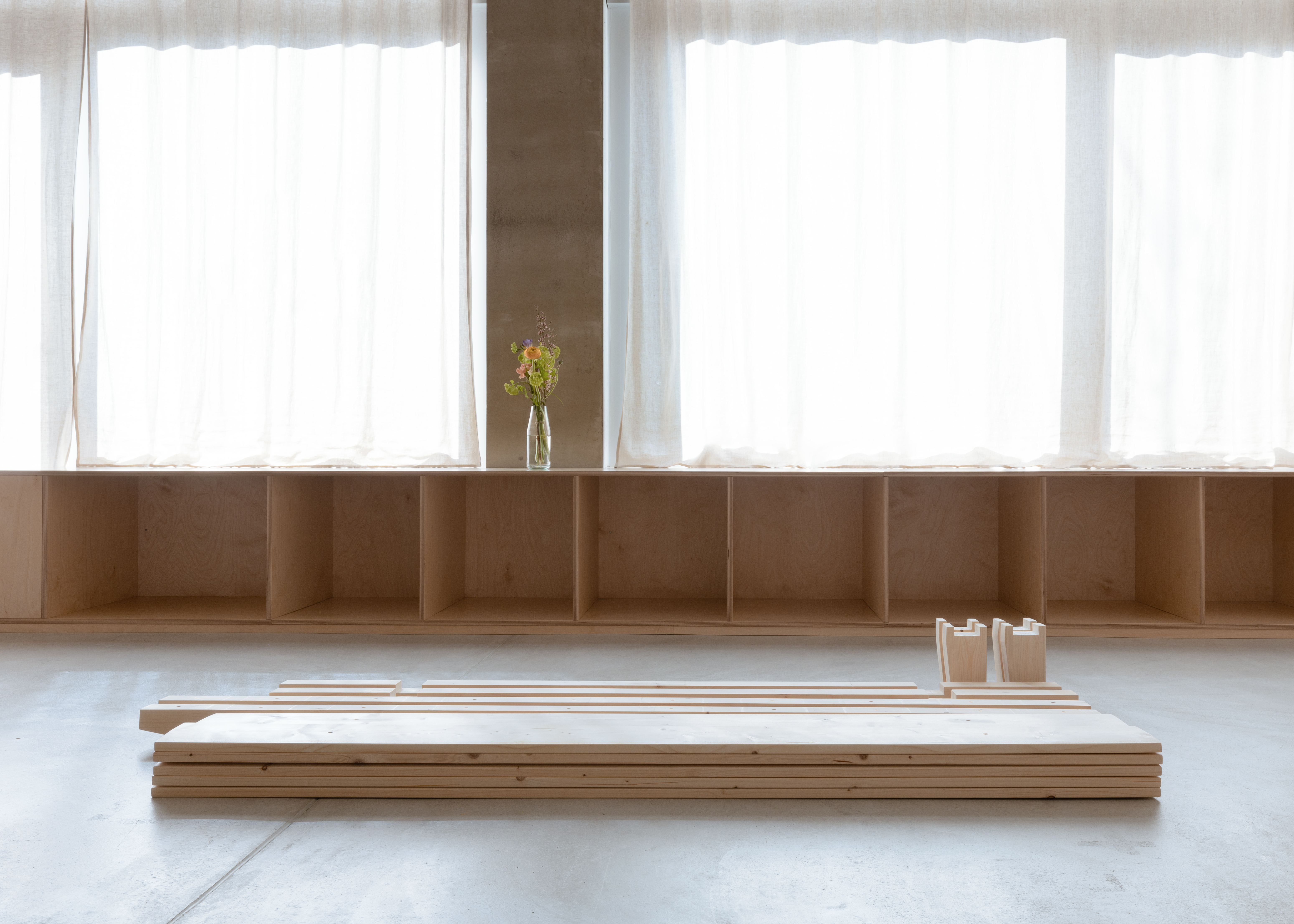 Das Bettgestell wird aus fünf verschiedenen Bauteilen aus Holz zusammengesetzt. Da weder Schrauben noch Klebstoff zum Einsatz kommen, kann das System beliebig oft zusammen gebaut und wieder auseinander genommen werden, ohne dabei Bauteile zu beschädigen. Zerlegt lässt sich das Bett mühelos transportieren oder platzsparend lagern.