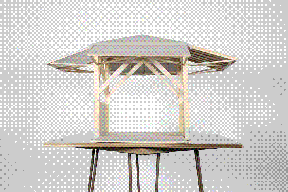 Die quadratische Grundform lässt das Bauwerk auf verschiedene örtliche Begebenheiten reagieren. Ebenso die Fassadenelemente, welche je nach Standort und Ausrichtung sowie Nutzung mehr oder weniger steil geneigt werden und so entweder als Hülle oder Dach respektive Boden fungieren. Ein Teil der Fassade ist mit Photovoltaik-Paneelen belegt. Diese erzeugen zusammen mit der Kraft der Sonne Energie, welche in Batterien gespeichert wird und als Strom zur Verfügung steht. Einzelne Bauteile können vorgefertigt und später mit den anderen Elementen zusammen gefügt werden.
